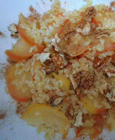 Milchreis: Rundkornreis in Wasser und Pflanzenmilch gekocht, mit gedünstetem Apfel oder Birne und Zimt mit Vollrohrzucker.